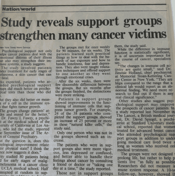 Chicago Tribune, “Study reveals support groups strengthen many cancer victims,” October 26, 1990.